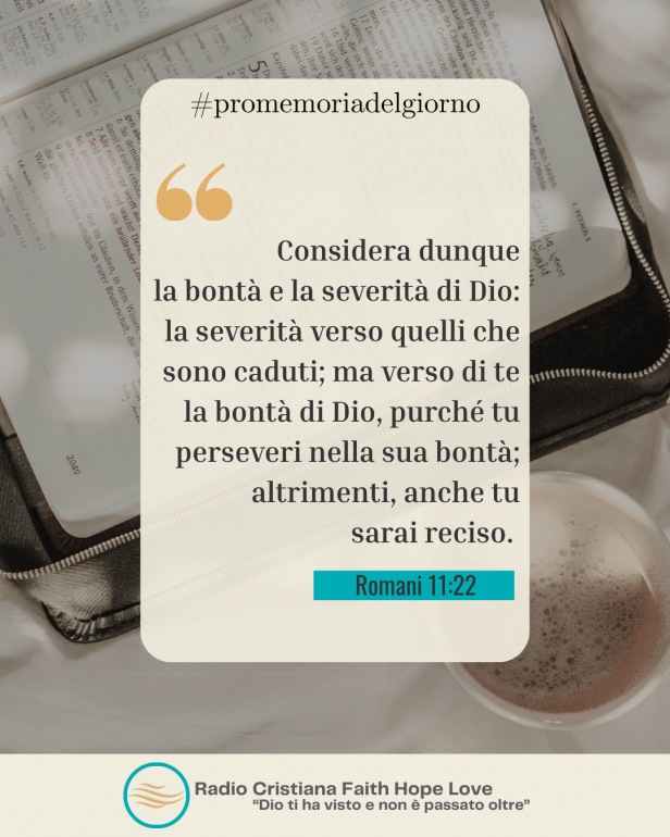 Considera dunque la bontà e la severità di Dio: la severità verso quelli che sono caduti; ma verso di te la bontà di Dio, purché tu perseveri nella sua bontà; altrimenti, anche tu sarai reciso.