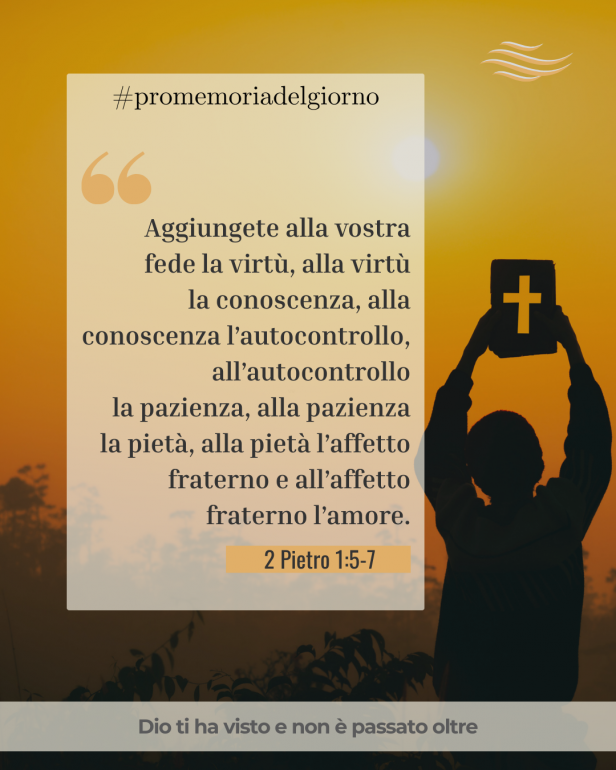 Voi, per questa stessa ragione, mettendoci da parte vostra ogni impegno, aggiungete alla vostra fede la virtù, alla virtù la conoscenza, alla conoscenza l’autocontrollo, all’autocontrollo la pazienza, alla pazienza la pietà, alla pietà l’affetto fraterno e all’affetto fraterno l’amore.