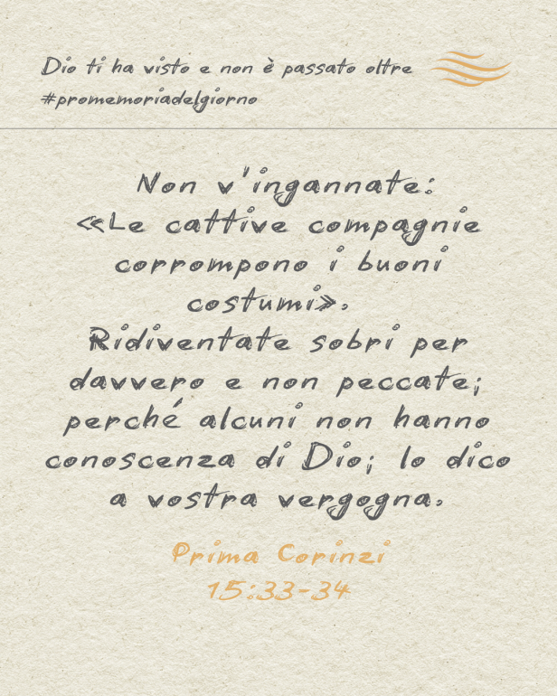 Non v’ingannate: «Le cattive compagnie corrompono i buoni costumi» . Ridiventate sobri per davvero e non peccate; perché alcuni non hanno conoscenza di Dio; lo dico a vostra vergogna.’
